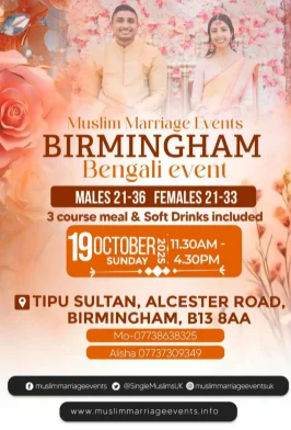 The Muslim Marriage Events Birmingham will host an exclusive Bengali Muslim Marriage Event on Sunday, October 19th, 2025, at the elegant Tipu Sultan Majestic Dining, 43 Alcester Road, Moseley, Birmingham, B13 8AA. Running from 11:30 AM to 4:30 PM, this event provides a welcoming environment for Bengali Muslims in the UK who are looking to find a compatible life partner within a respectful and faith-based setting.